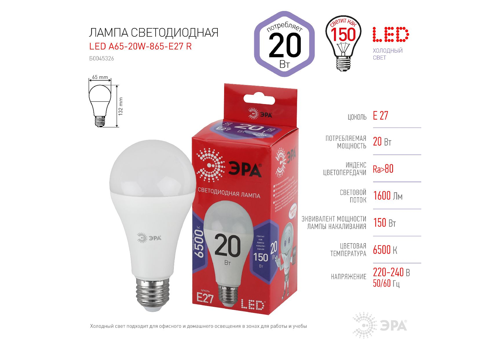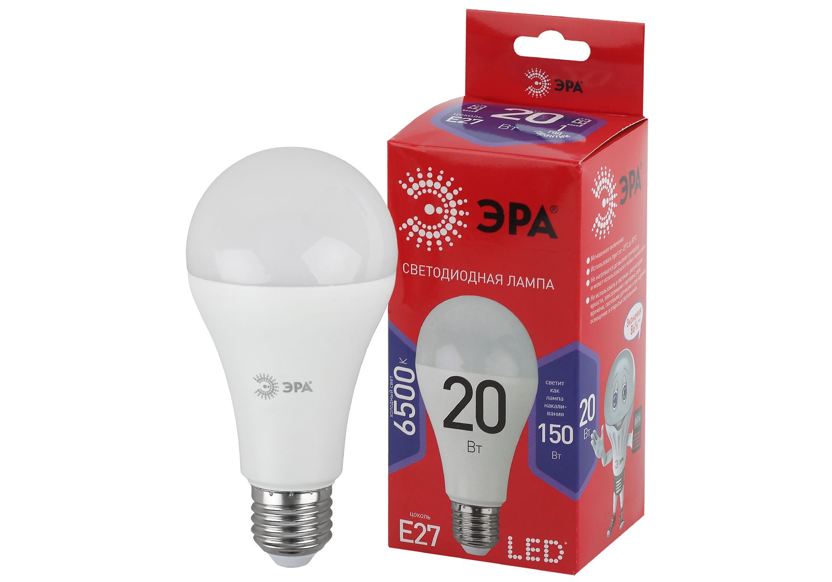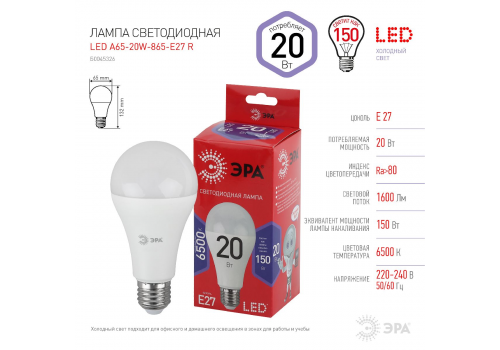 Лампа светодиодная Эра E27 20W 6500K LED A65-20W-865-E27 R Б0045326