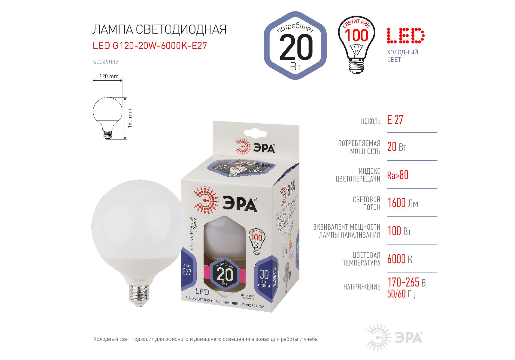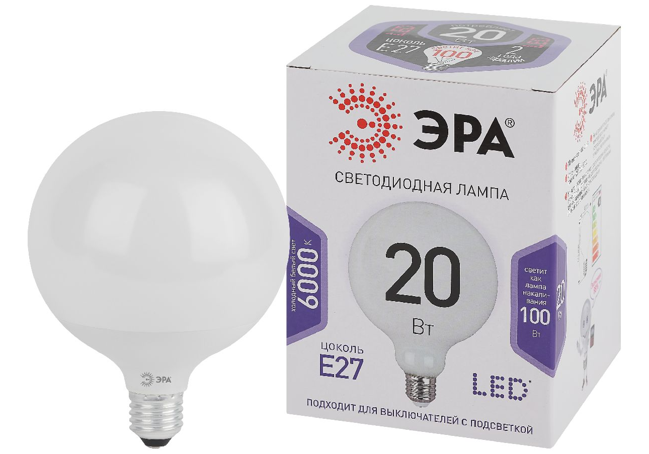 Лампа светодиодная Эра E27 20W 6500K LED G120-20W-6000K-E27 Б0049082