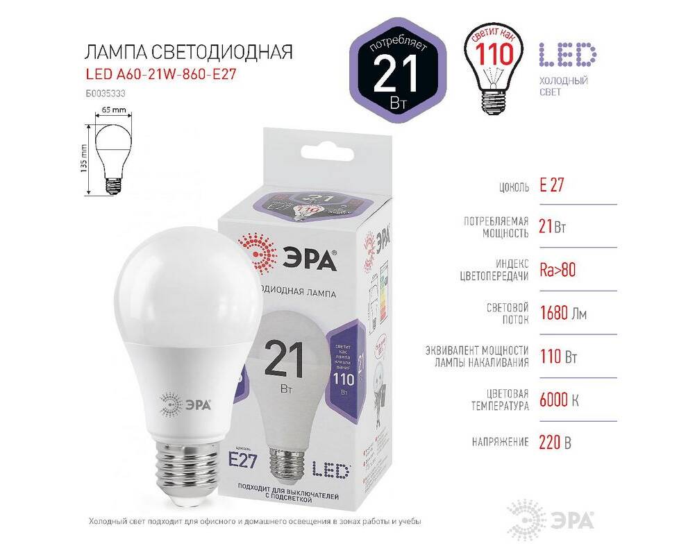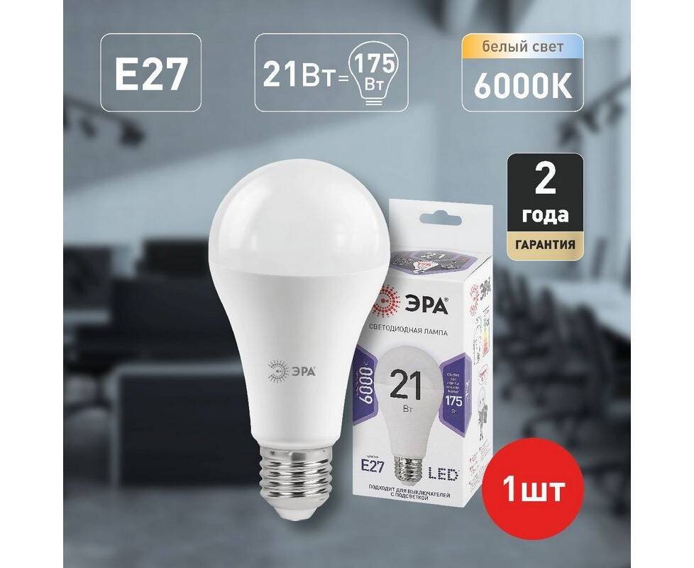Лампа светодиодная Эра E27 21W 6000K LED A65-21W-860-E27 Б0035333