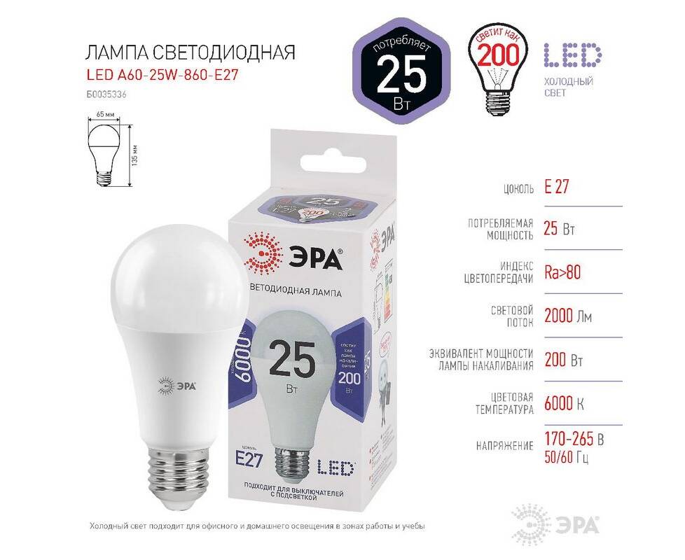 Лампа светодиодная Эра E27 25W 6000K LED A65-25W-860-E27 Б0035336