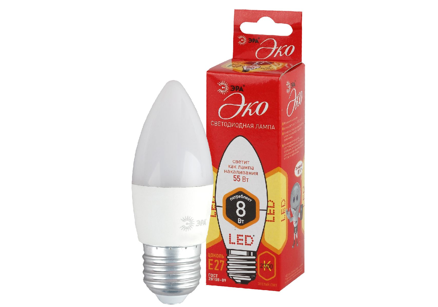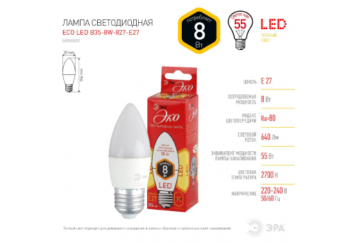 Лампа светодиодная Эра E27 8W 2700K ECO LED B35-8W-827-E27 Б0030020