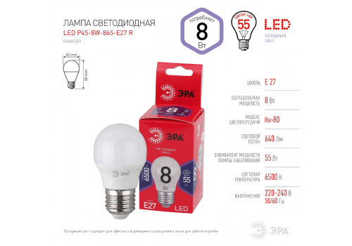 Лампа светодиодная Эра E27 8W 6500K LED P45-8W-865-E27 R Б0045359