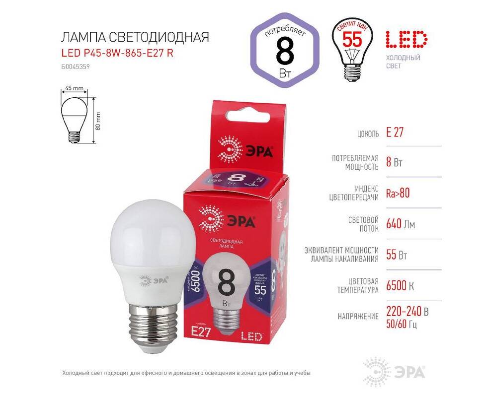 Лампа светодиодная Эра E27 8W 6500K LED P45-8W-865-E27 R Б0045359
