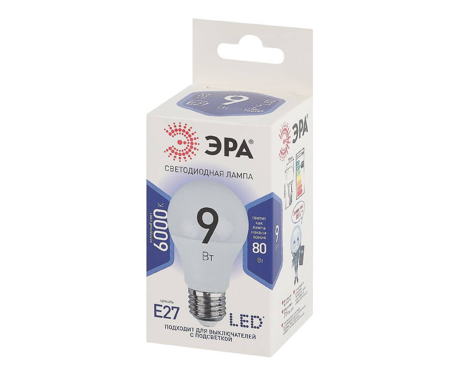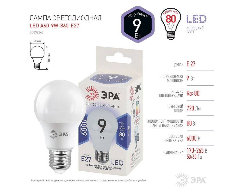 Лампа светодиодная Эра E27 9W 6000K LED A60-9W-860-E27 Б0032248