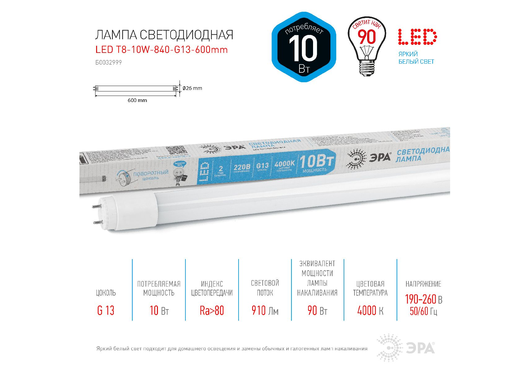 Лампа светодиодная Эра G13 10W 4000K LED T8-10W-840-G13-600mm Б0032999