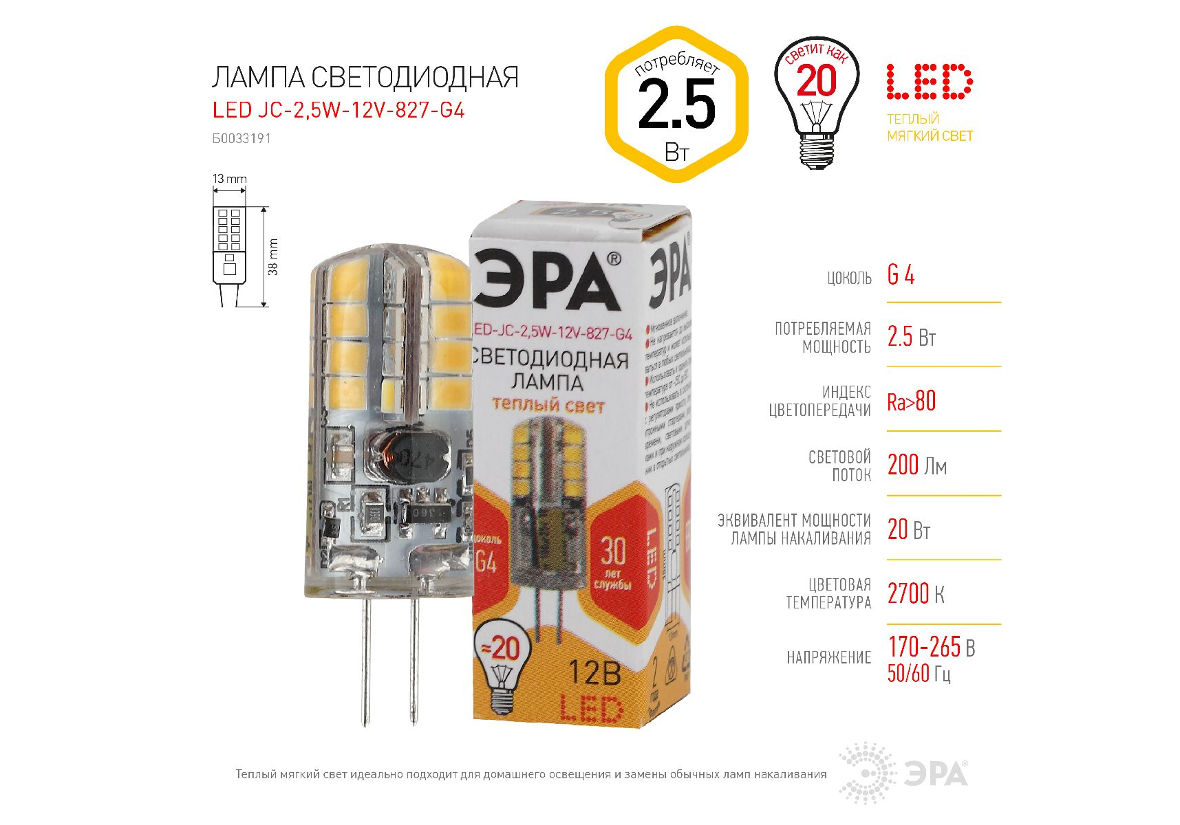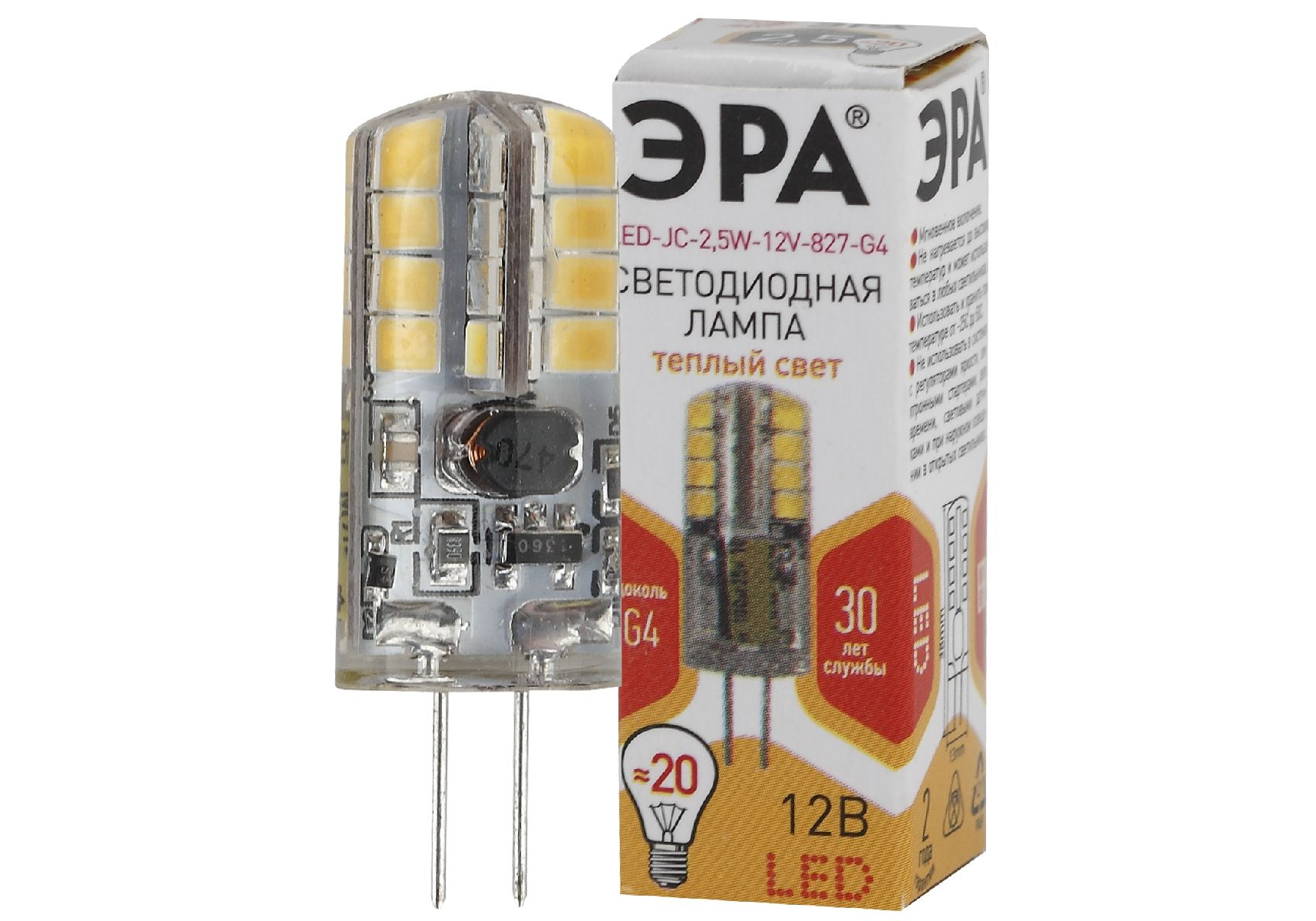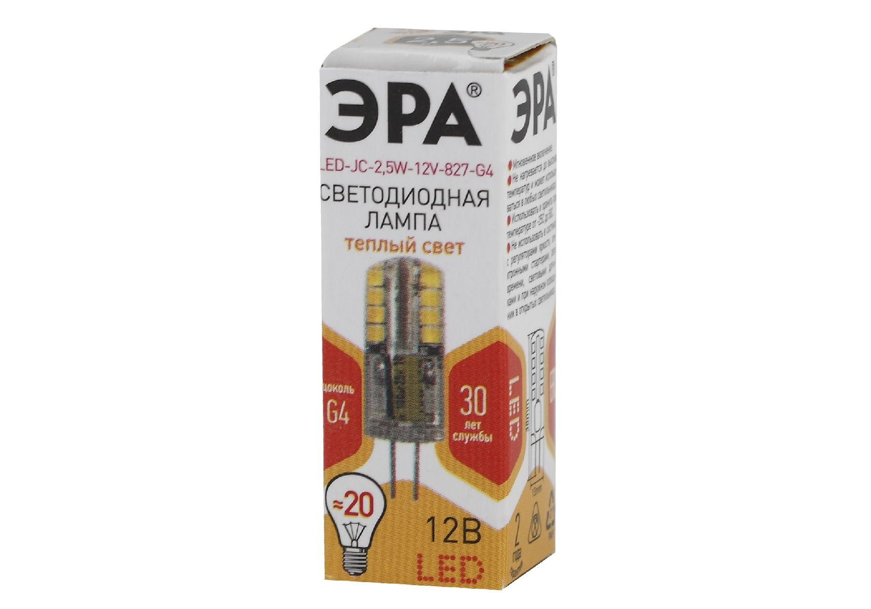 Лампа светодиодная Эра G4 2,5W 2700K LED JC-2,5W-12V-827-G4 Б0033191