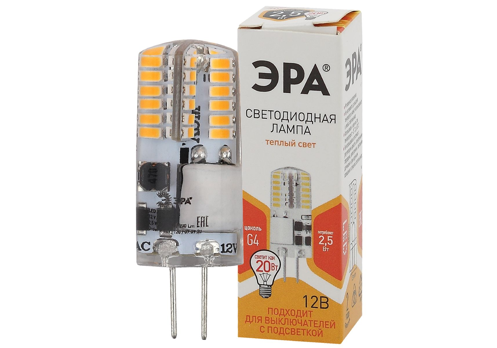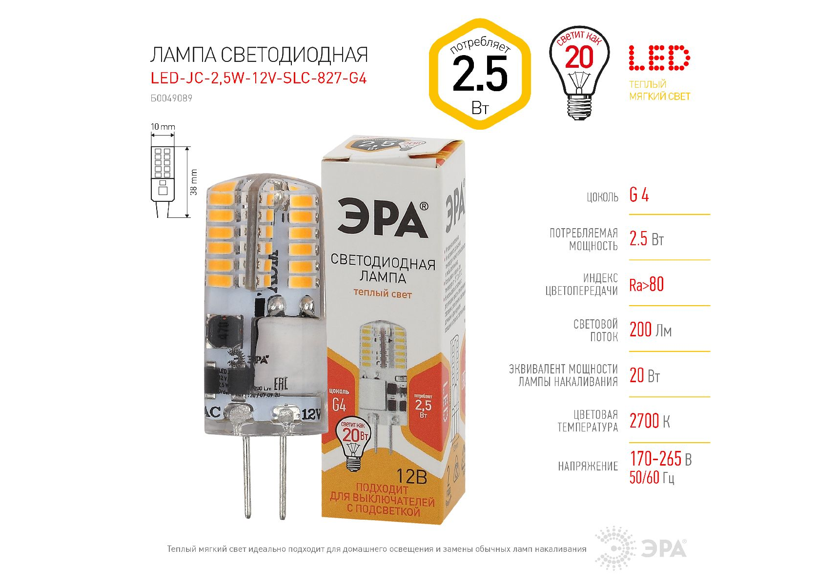 Лампа светодиодная Эра G4 2,5W 2700K LED-JC-2,5W-12V-SLC-827-G4 Б0049089