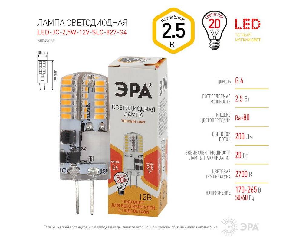 Лампа светодиодная Эра G4 2,5W 2700K LED-JC-2,5W-12V-SLC-827-G4 Б0049089