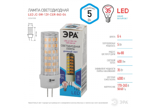Лампа светодиодная Эра G4 5W 4000K LED JC-5W-12V-CER-840-G4 Б0049088