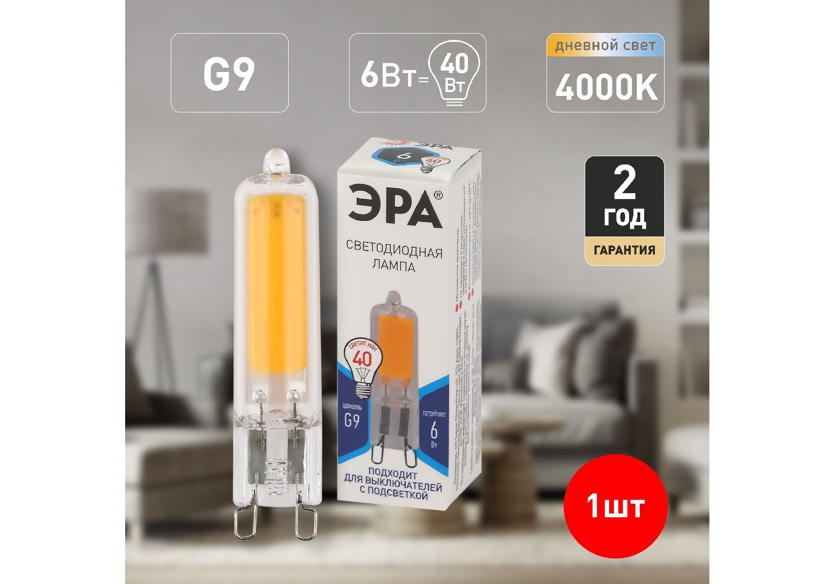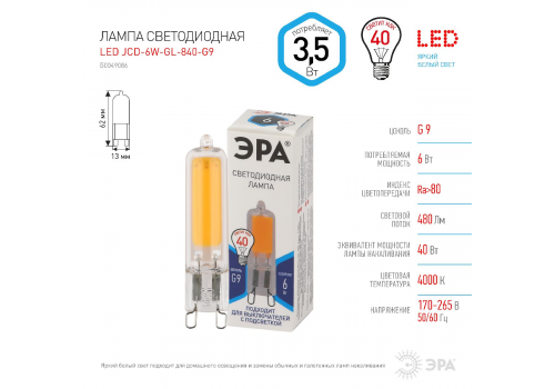 Лампа светодиодная Эра G9 6W 4000K LED JCD-6W-GL-840-G9 Б0049086