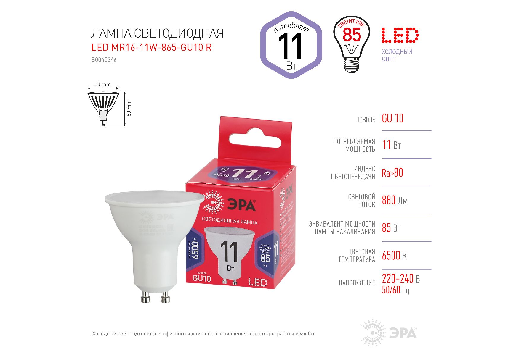 Лампа светодиодная Эра GU10 11W 6500K LED MR16-11W-865-GU10 R Б0045346