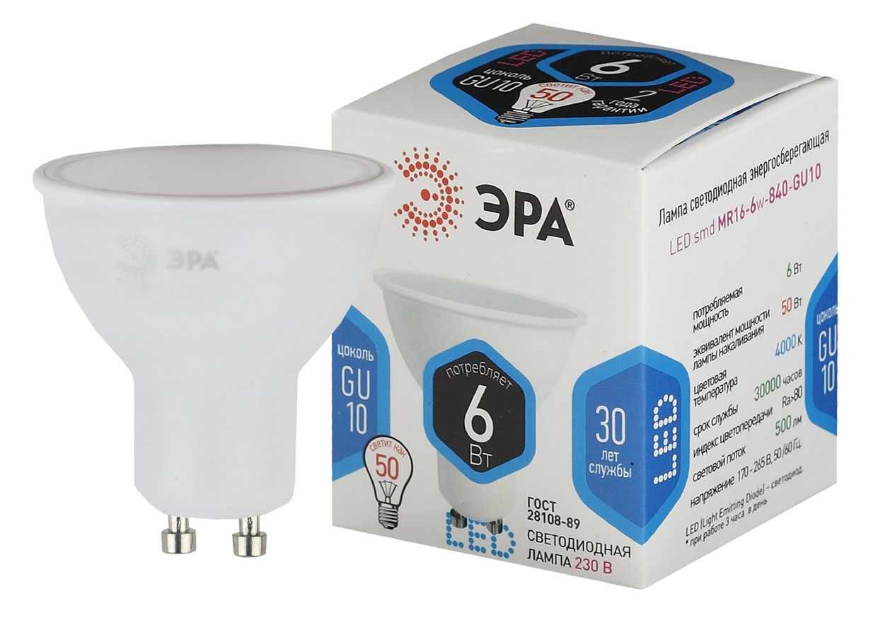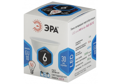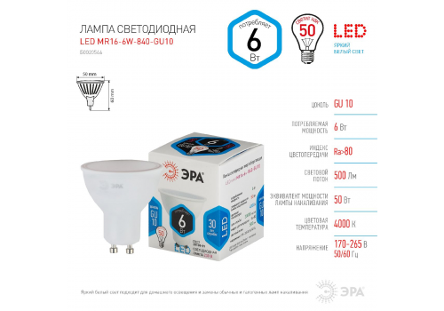 Лампа светодиодная Эра GU10 6W 4000K LED MR16-6W-840-GU10 Б0020544