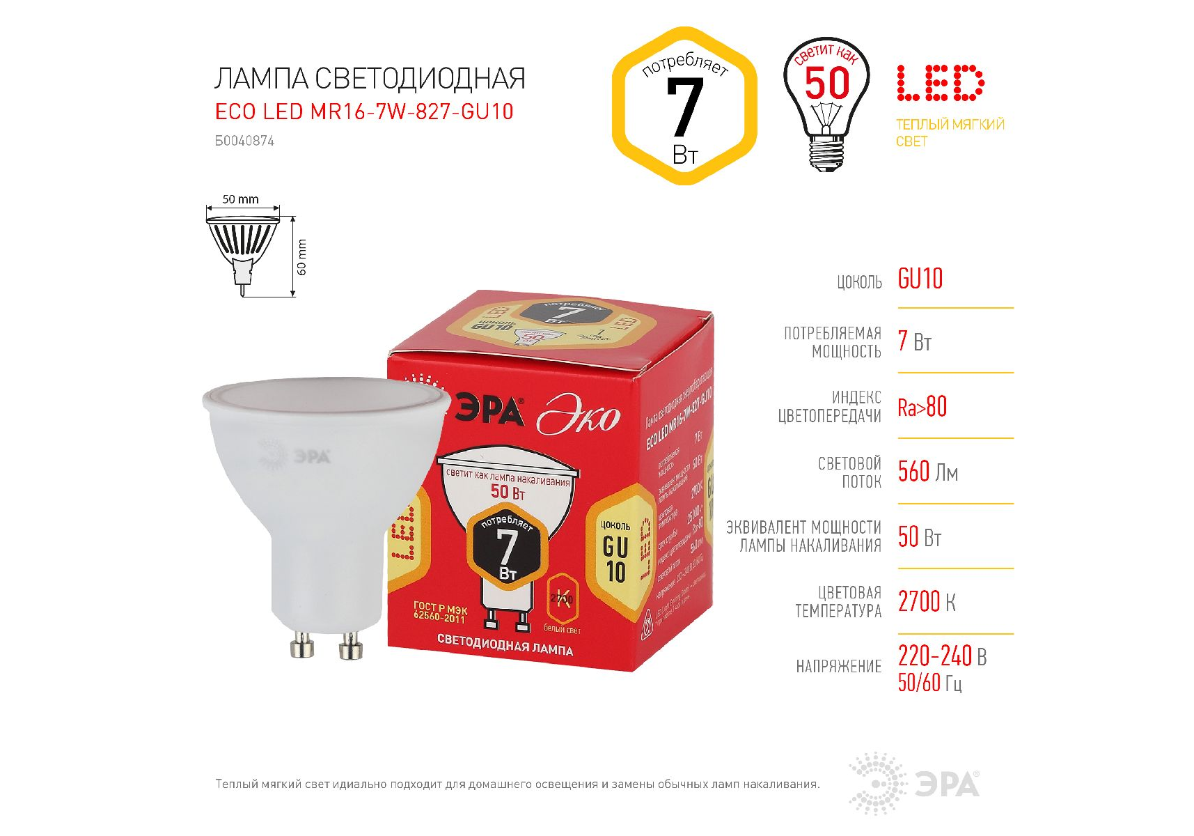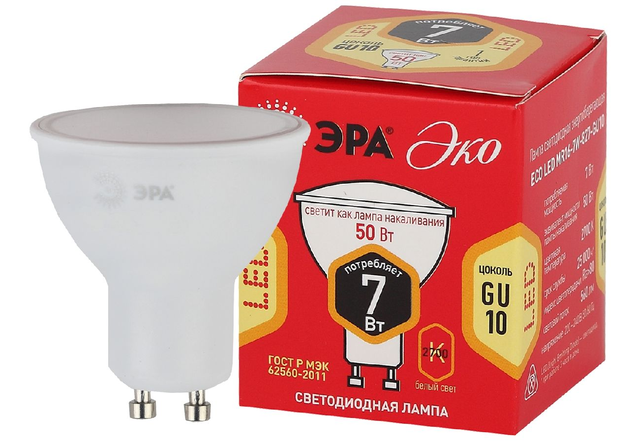 Лампа светодиодная Эра GU10 7W 2700K ECO LED MR16-7W-827-GU10 Б0040874