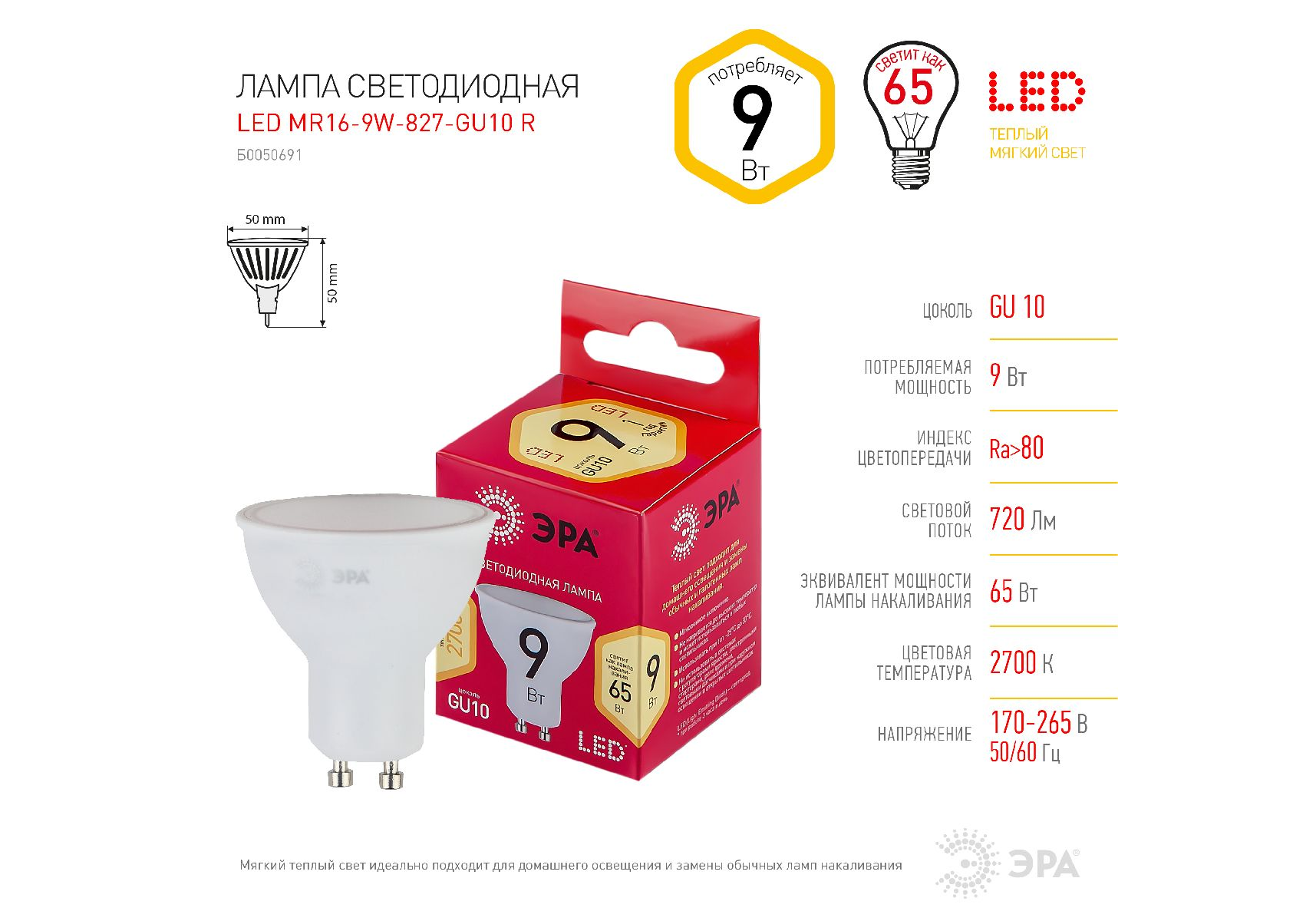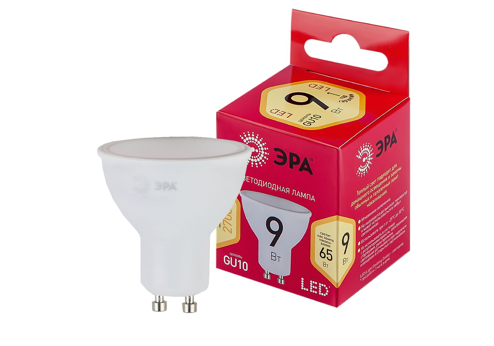 Лампа светодиодная Эра GU10 9W 2700K LED MR16-9W-827-GU10 R Б0050691