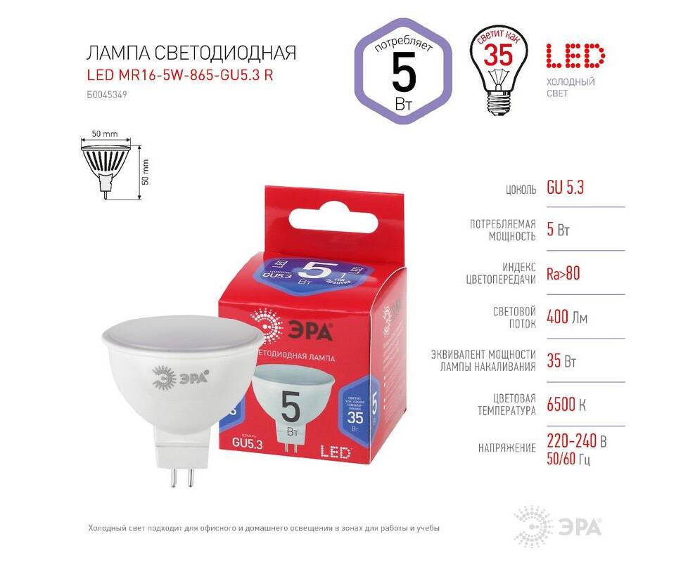 Лампа светодиодная Эра GU5.3 5W 6500K LED MR16-5W-865-GU5.3 R Б0045349