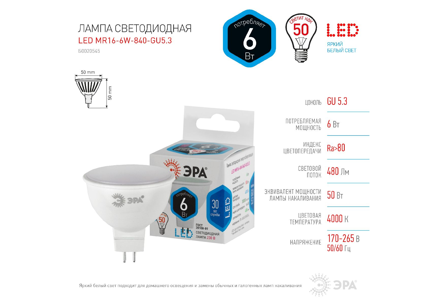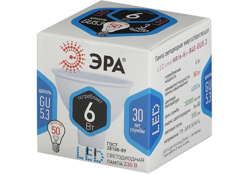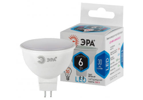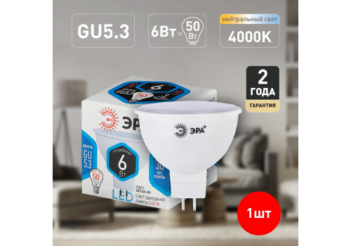 Лампа светодиодная Эра GU5.3 6W 4000K LED MR16-6W-840-GU5.3 Б0020545