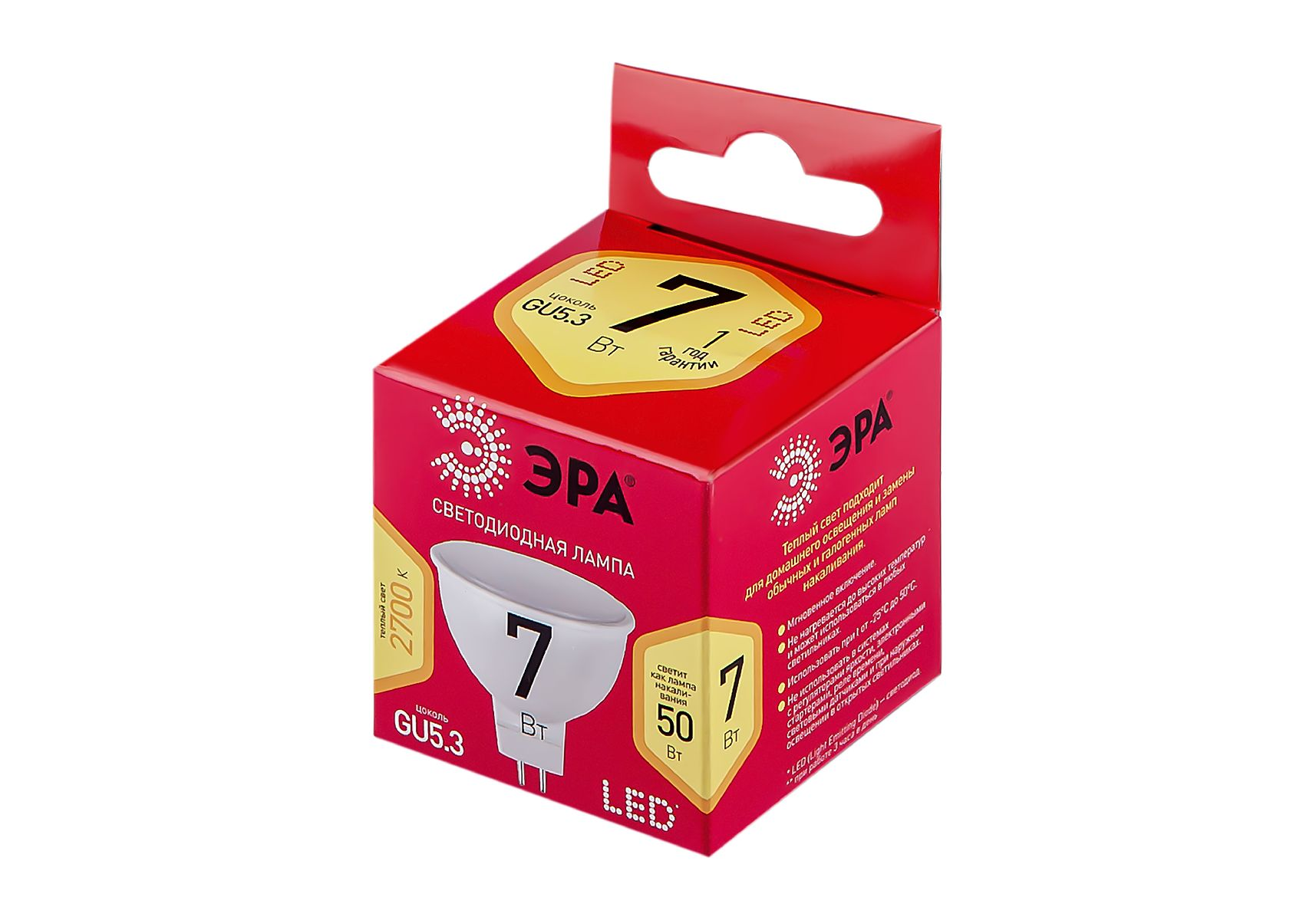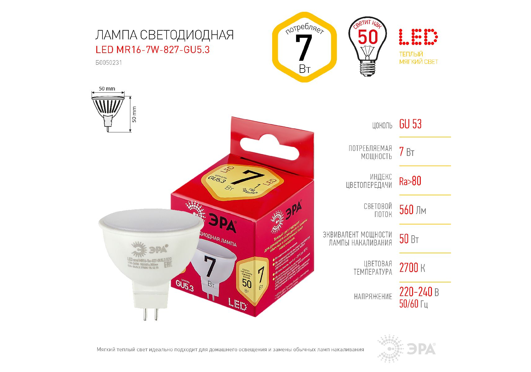 Лампа светодиодная Эра GU5.3 7W 2700K LED MR16-7W-827-GU5.3 R Б0050231