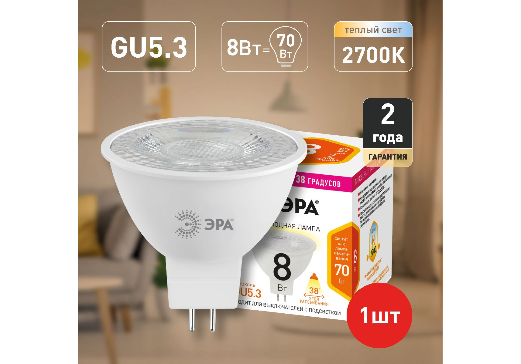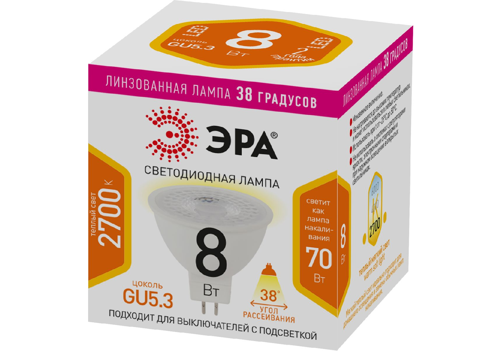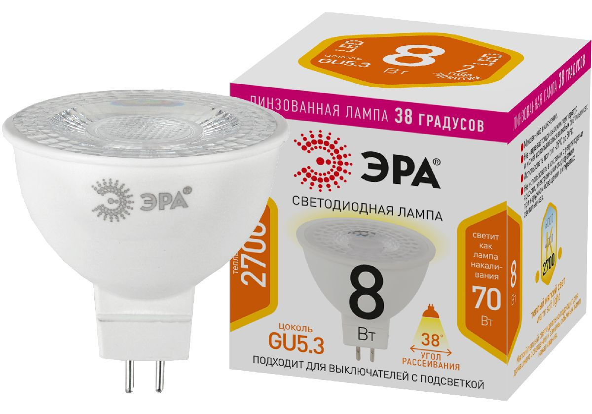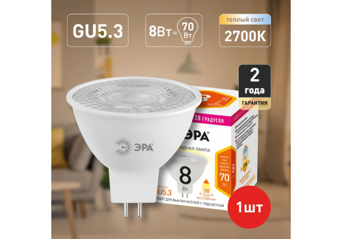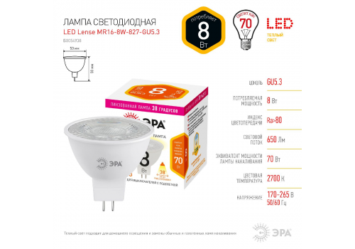 Лампа светодиодная Эра GU5.3 8W 2700K LED Lense MR16-8W-827-GU5.3 Б0054938