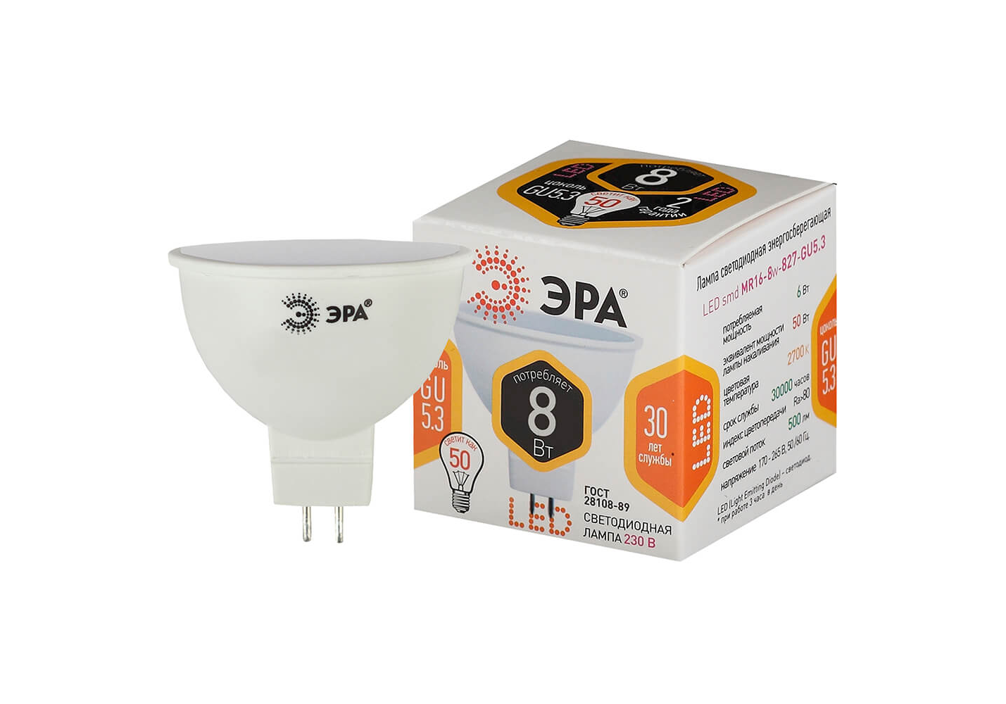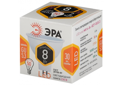 Лампа светодиодная ЭРА GU5.3 8W 2700K матовая LED MR16-8W-827-GU5.3 Б0020546
