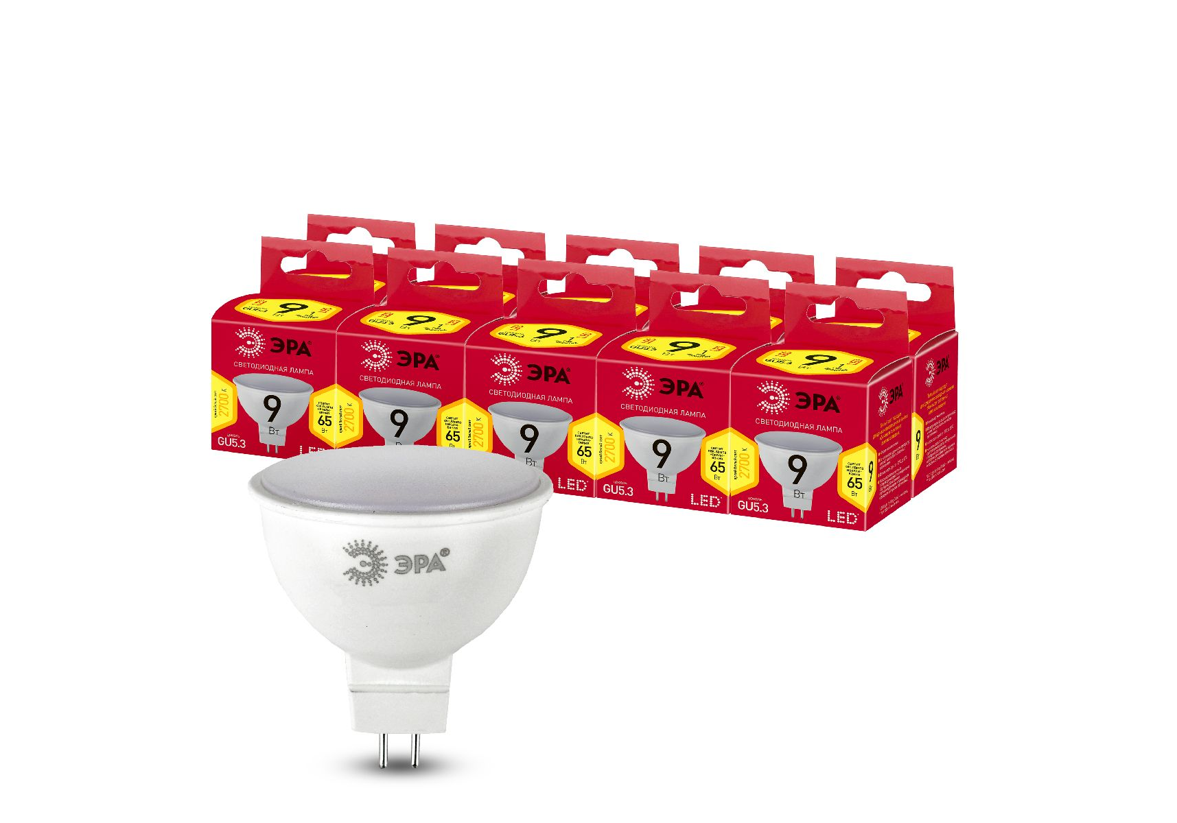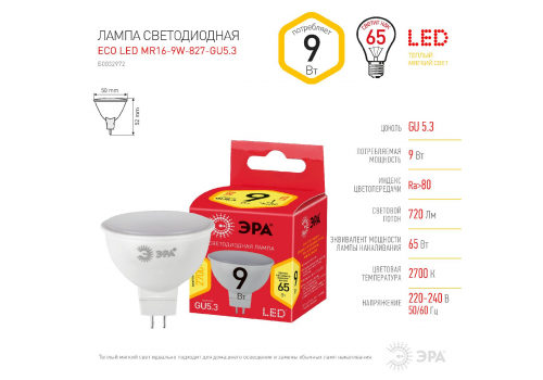 Лампа светодиодная Эра GU5.3 9W 2700K LED MR16-9W-827-GU5.3 R Б0054239