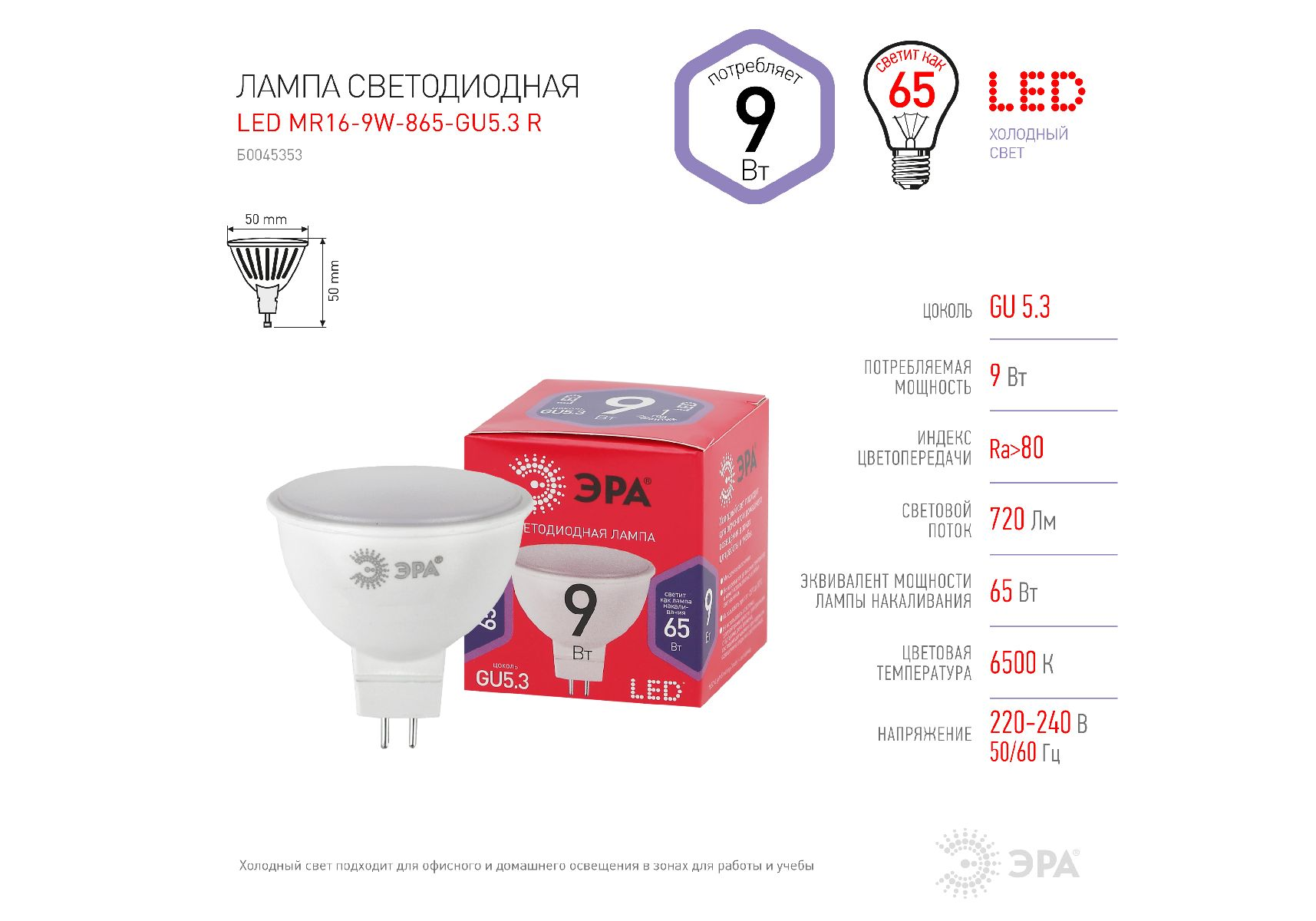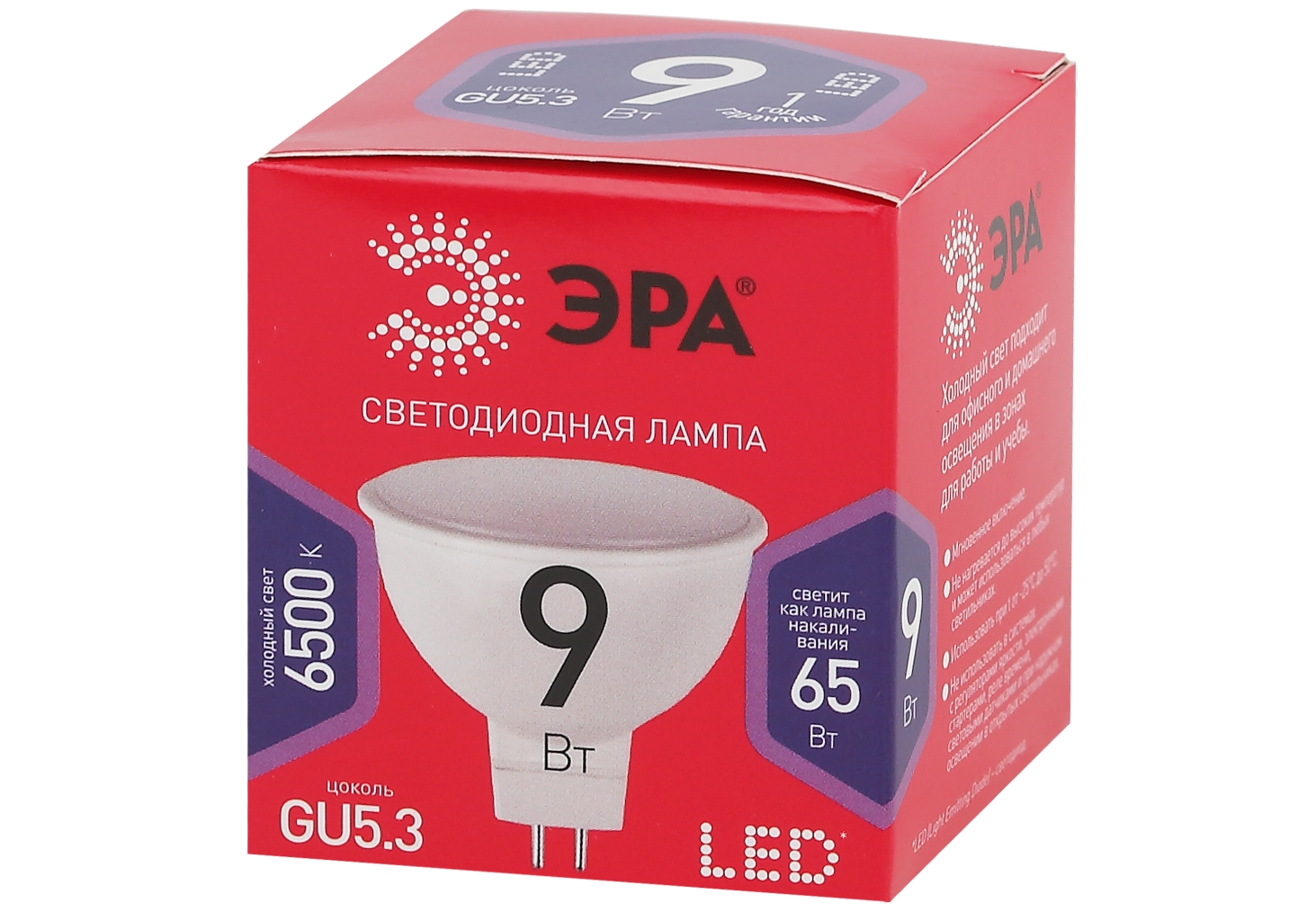 Лампа светодиодная Эра GU5.3 9W 6500K LED MR16-9W-865-GU5.3 R Б0045353