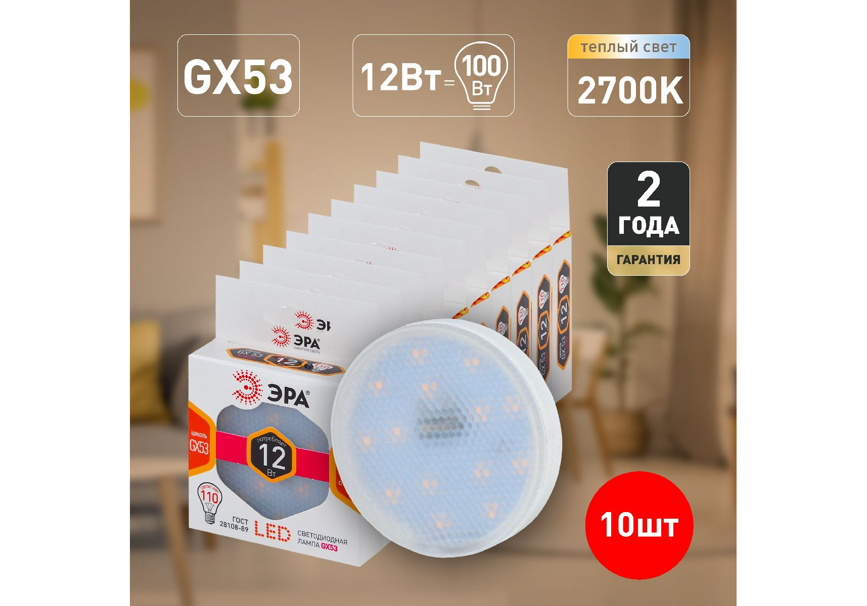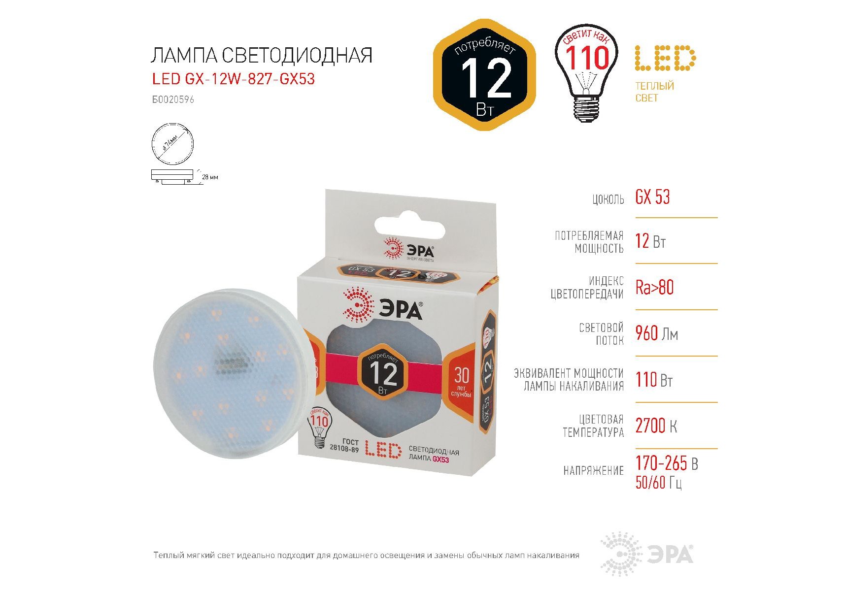 Лампа светодиодная Эра GX53 12W 2700K LED GX-12W-827-GX53 Б0020596