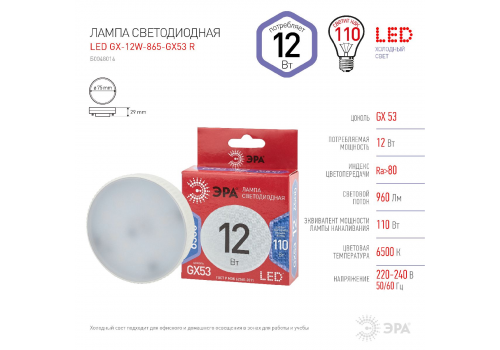 Лампа светодиодная Эра GX53 12W 6500K LED GX-12W-865-GX53 R Б0048014