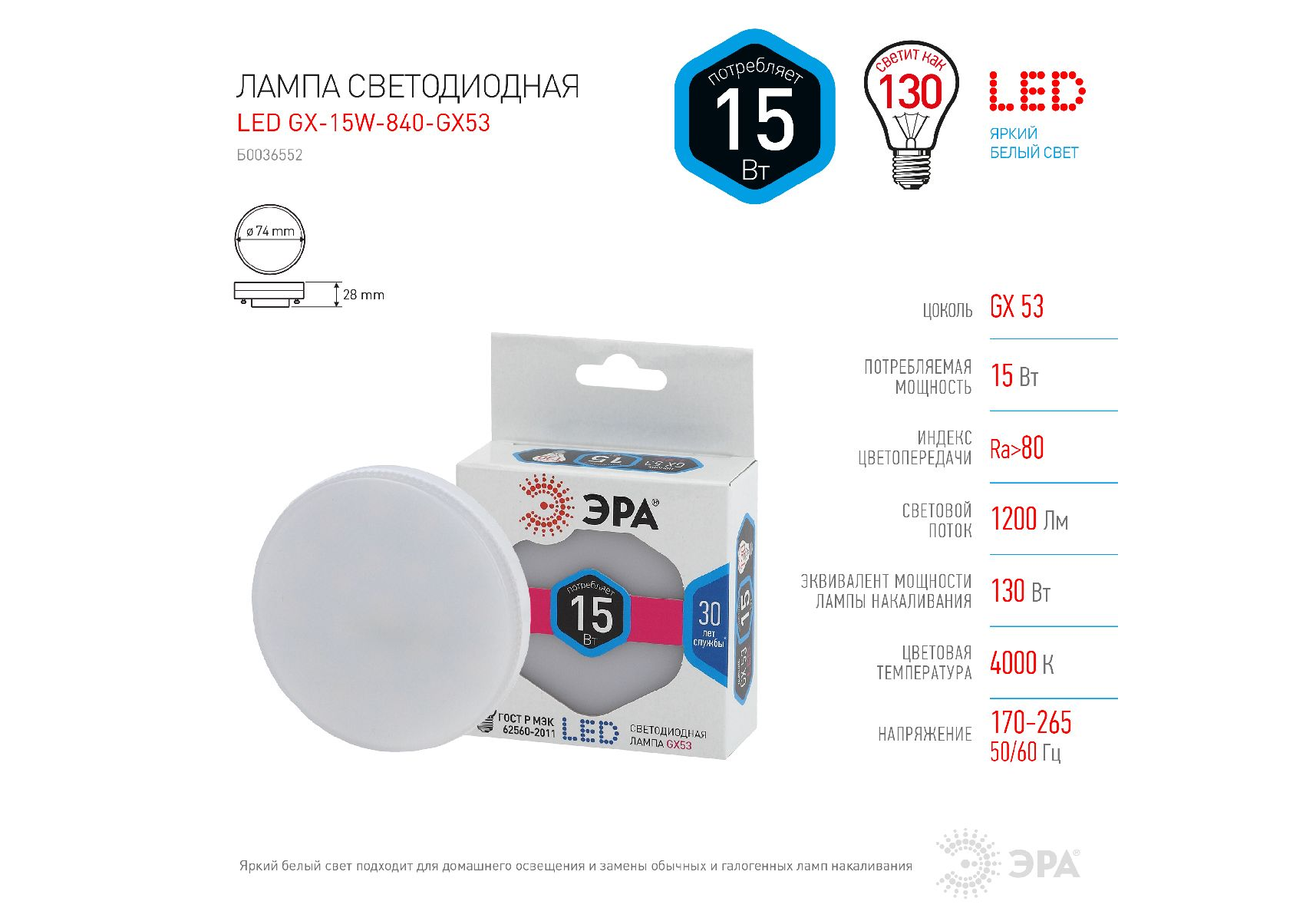 Лампа светодиодная Эра GX53 15W 4000K LED GX-15W-840-GX53 Б0036552