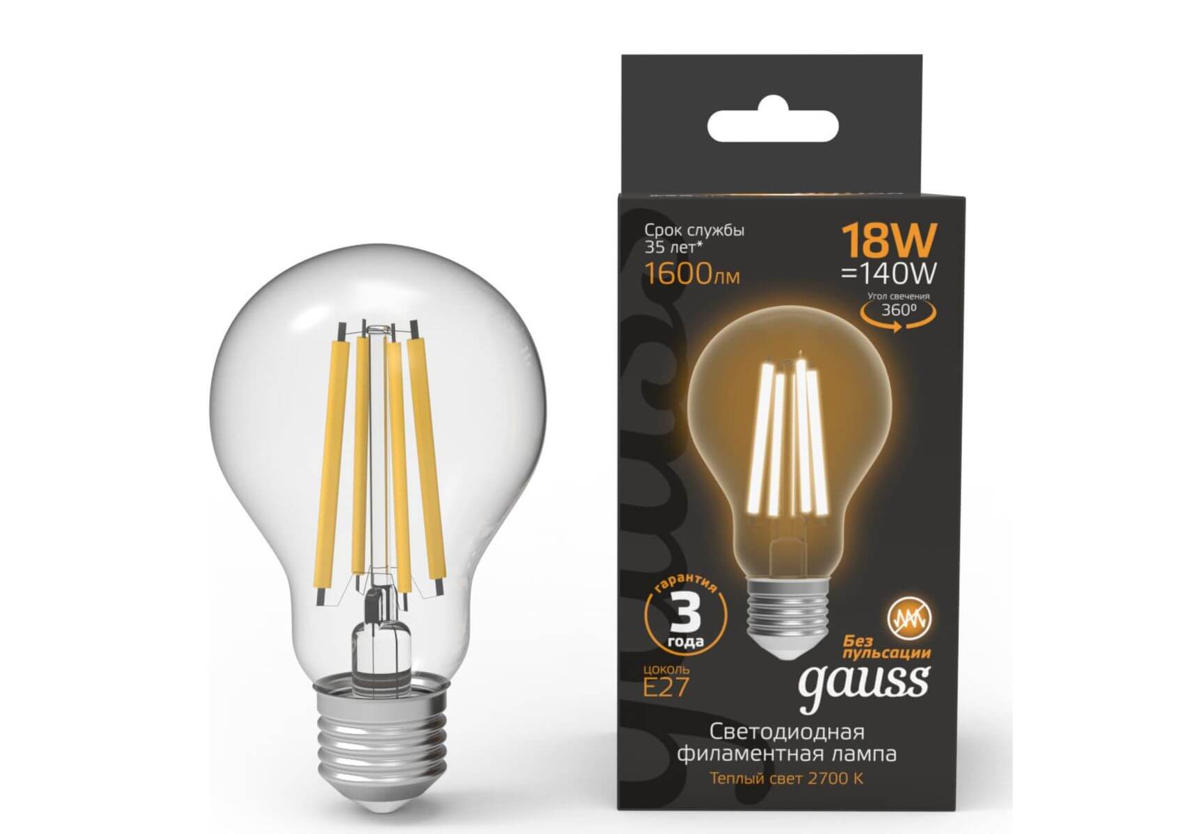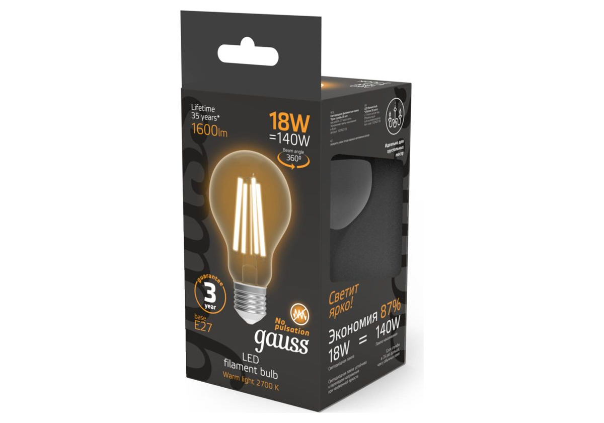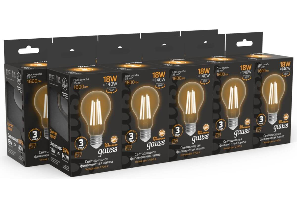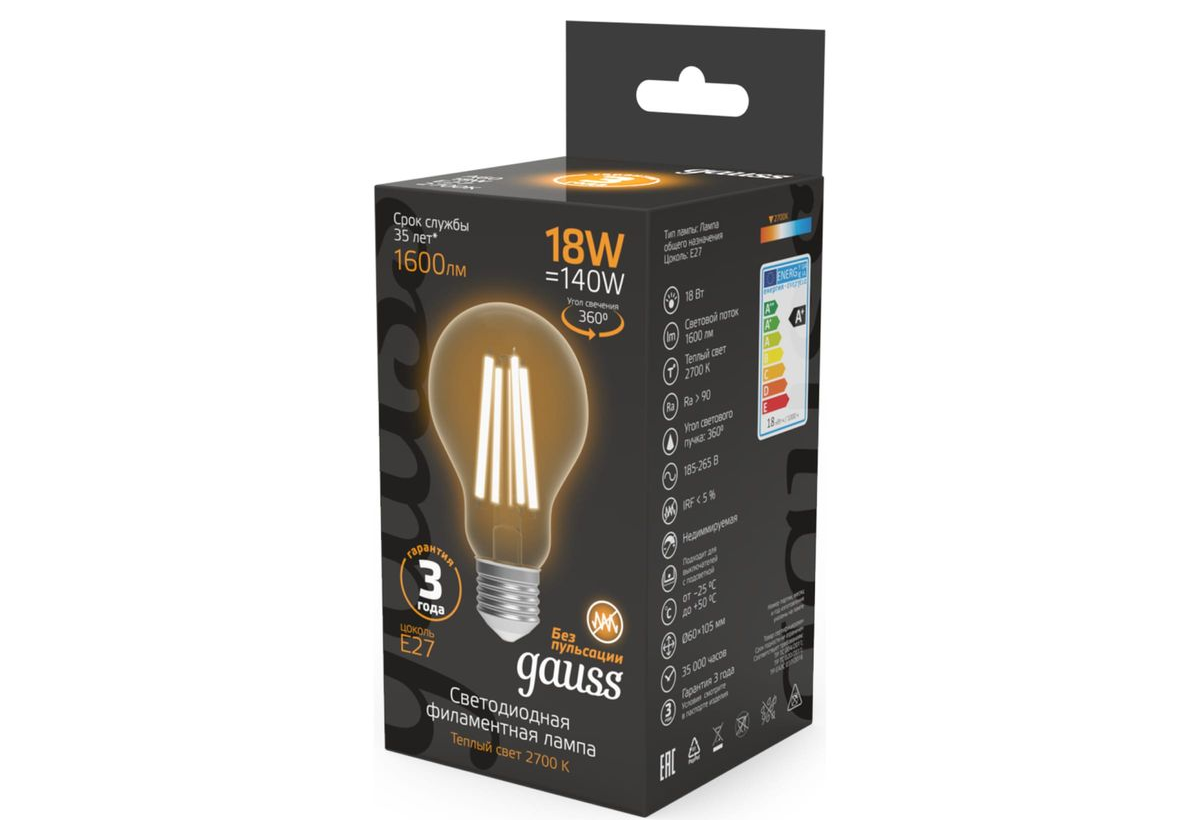 Лампа светодиодная филаментная Gauss E27 18W 2700K прозрачная 102902118