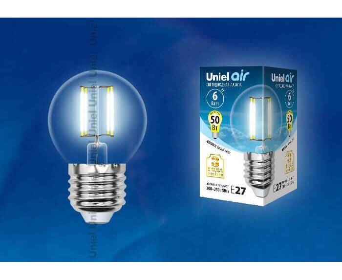 Лампа светодиодная филаментная (UL-00002208) Uniel E27 6W 4000K прозрачная LED-G45-6W/NW/E27/CL GLA0