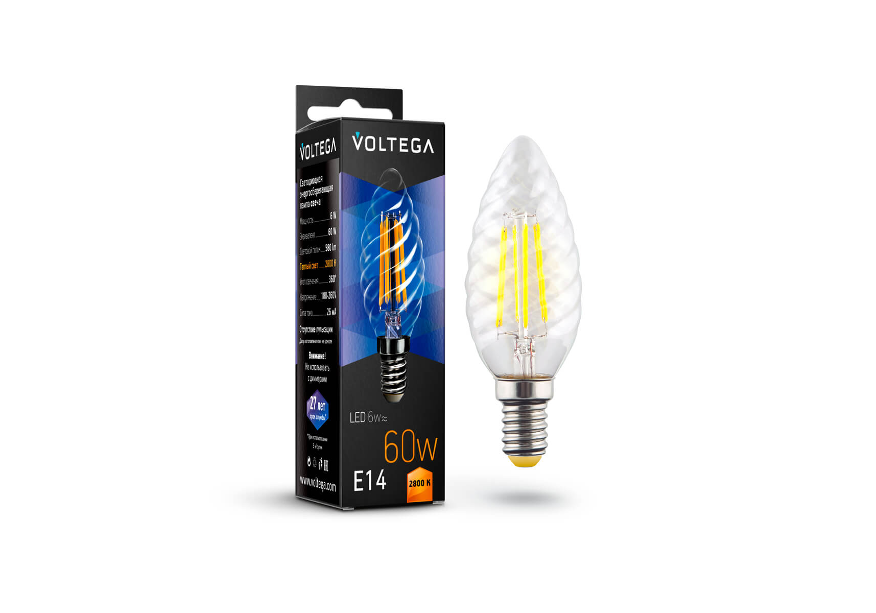 Лампа светодиодная филаментная Voltega E14 6W 2800К прозрачная VG10-CC1E14warm6W-F 7027