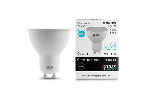 Лампа светодиодная Gauss GU10 5.5W 4100K матовая 13626