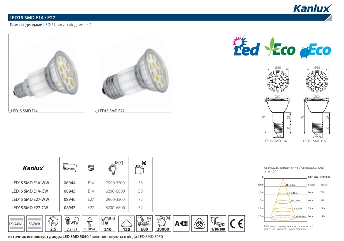 Лампа светодиодная Kanlux LED15 E27 2,5W 6200-6800К 8947