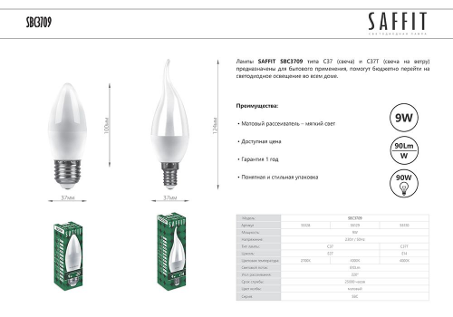Лампа светодиодная Saffit E14 9W 4000K матовая SBC3709 55130