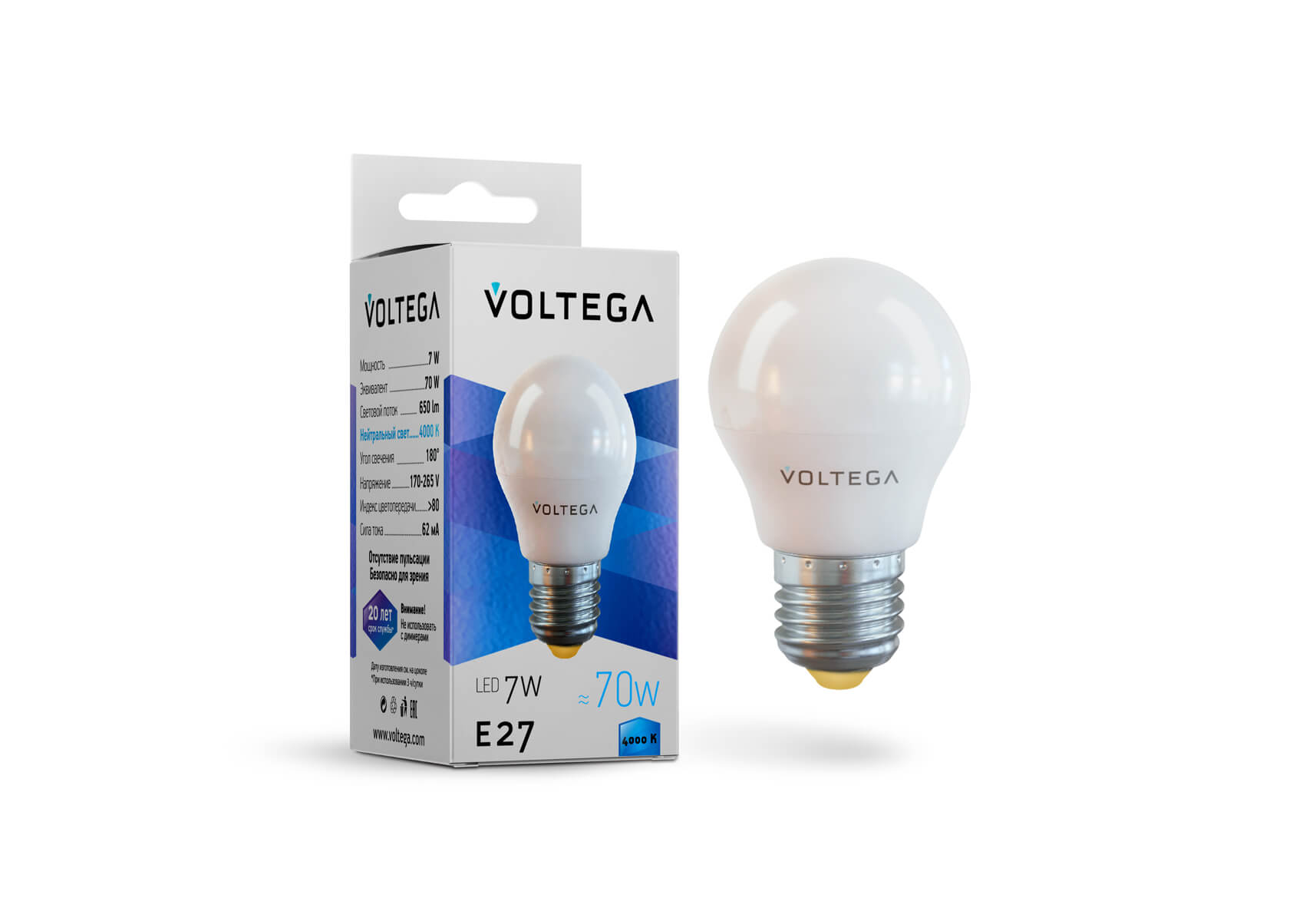 Лампа светодиодная Voltega E27 7W 4000К матовая VG2-G45E27cold7W 7053