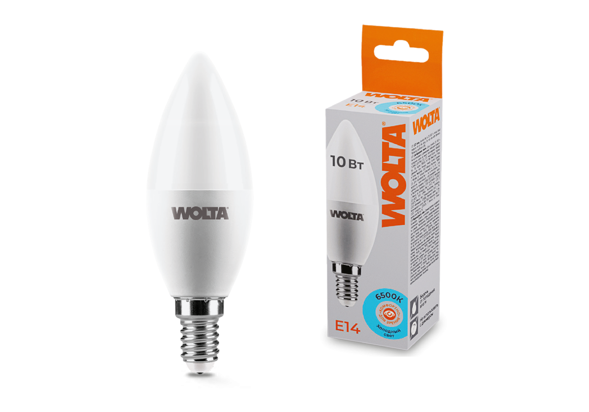 Светодиодная лампа WOLTA 10Вт 6500K E14 свеча матовая 25WC10E14