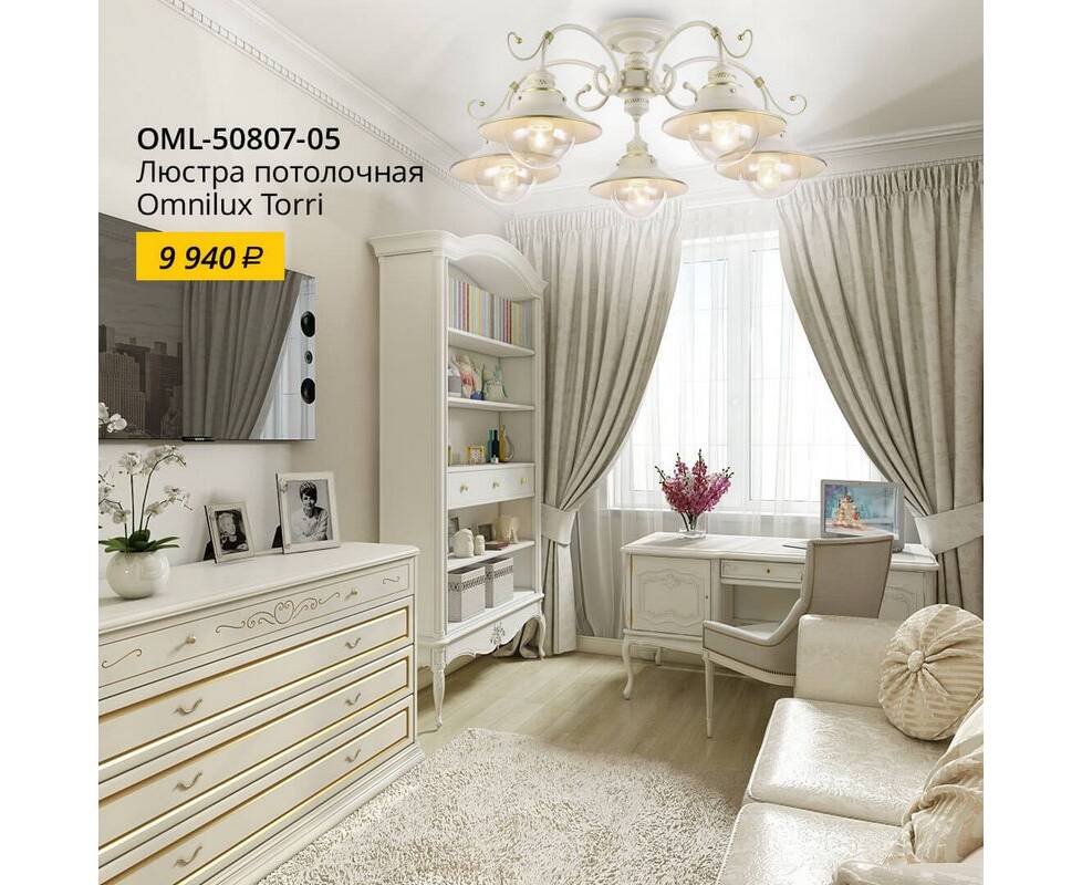 Потолочная люстра OML-50807-05 Torri от известного бренда Omnilux отличается превосходным дизайном и особенно хорошо подойдет для спальни в стиле кантри. Каркас из металла кремового цвета, 5 ламп с цоколем E27 и высококачественное покрытие придают данной модели потрясающий внешний вид. Люстра осветит комнату площадью до 10 м2, при использовании рекомендуемых производителем или эквивалентных по световому потоку LED ламп (в комплект не входят). Модель OML-50807-05 Torri можно устанавливать на натяжной потолок с использованием стандартной монтажной планки. *При установке на натяжной потолок допускается использовать только светодиодные LED лампы. Родиной бренда Omnilux является КИТАЙ. Заявленный производителем Omnilux гарантийный срок составляет 2 года. Потолочная люстра Omnilux Torri OML-50807-05 будет отличным выбором для покупки в интернет-магазине ГиперСвет. Мы оперативно доставим Ваш заказ по Калуге, Москве или в любой другой регион России.