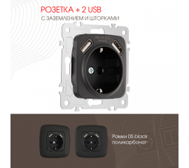 Розетка с заземлением, шторками + 2 USB Arte Milano 205.47-1.black