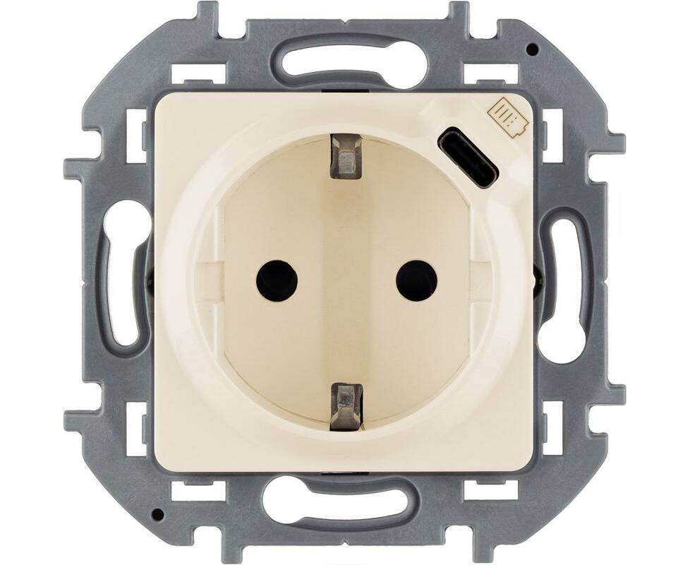 Розетка 2К+З немецкий стандарт 16А 250В со встроенным зарядным устройством USB C 1.5А 5В - INSPIRIA - слоновая кость