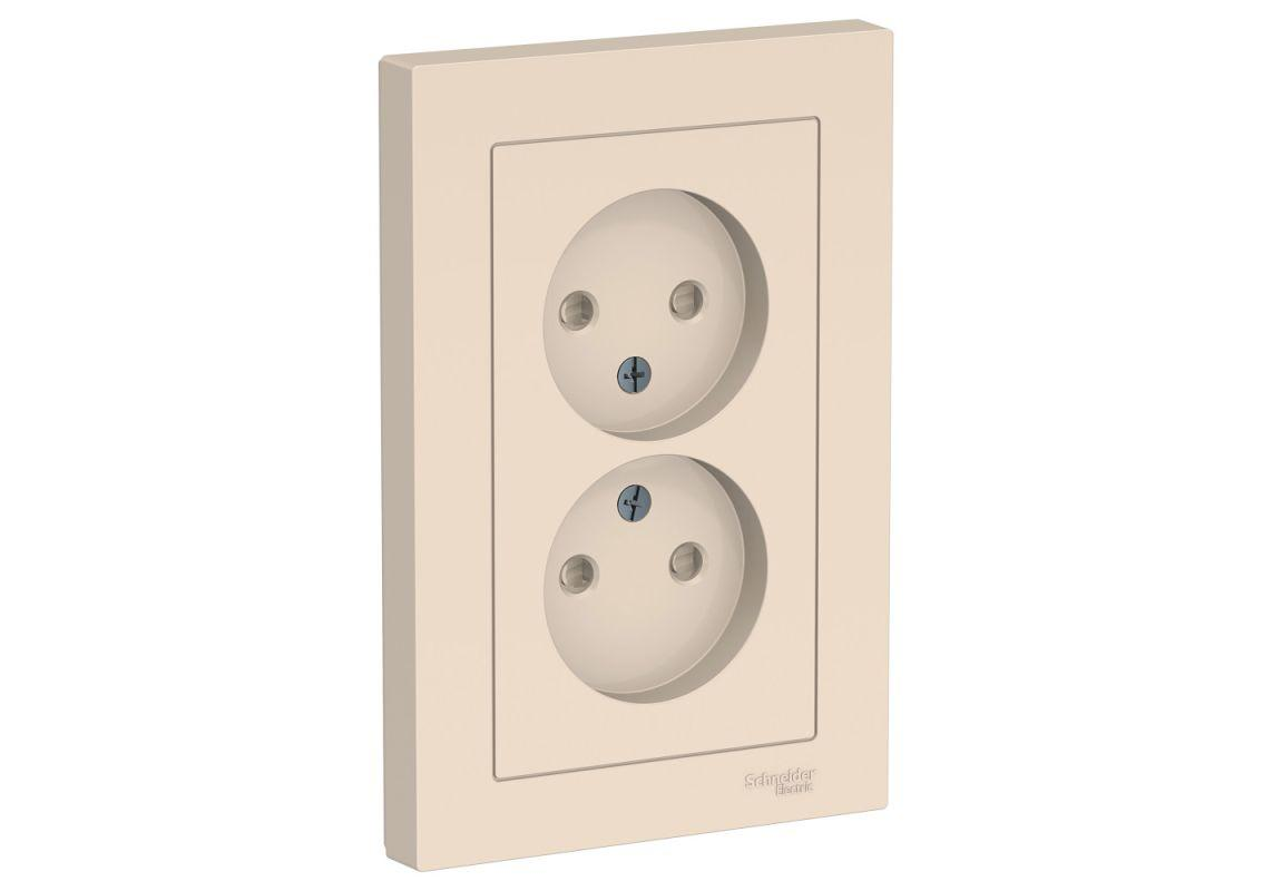 Розетка двухместная с рамкой Systeme Electric ATLASDESIGN, скрытый монтаж, без заземления, со шторками, винтовые клеммы, бежевый