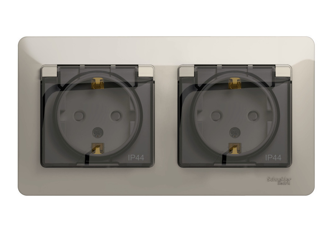 Розетка моноблок в две монтажные коробки Glossa, со шторками, с крышкой, с заземлением, двойная, винтовые клеммы, молочный