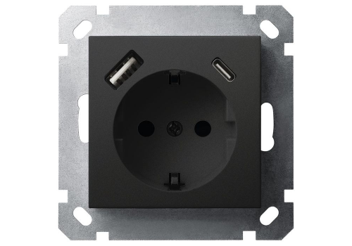 Розетка SHUKO Jasmart с USB тип USB A-C с защитными шторками черный матовый (soft touch) 25W 16A 250