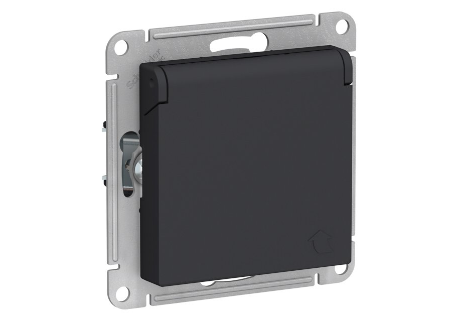 Розетка Systeme Electric ATLASDESIGN, скрытый монтаж, с заземлением, с крышкой, со шторками, карбон
