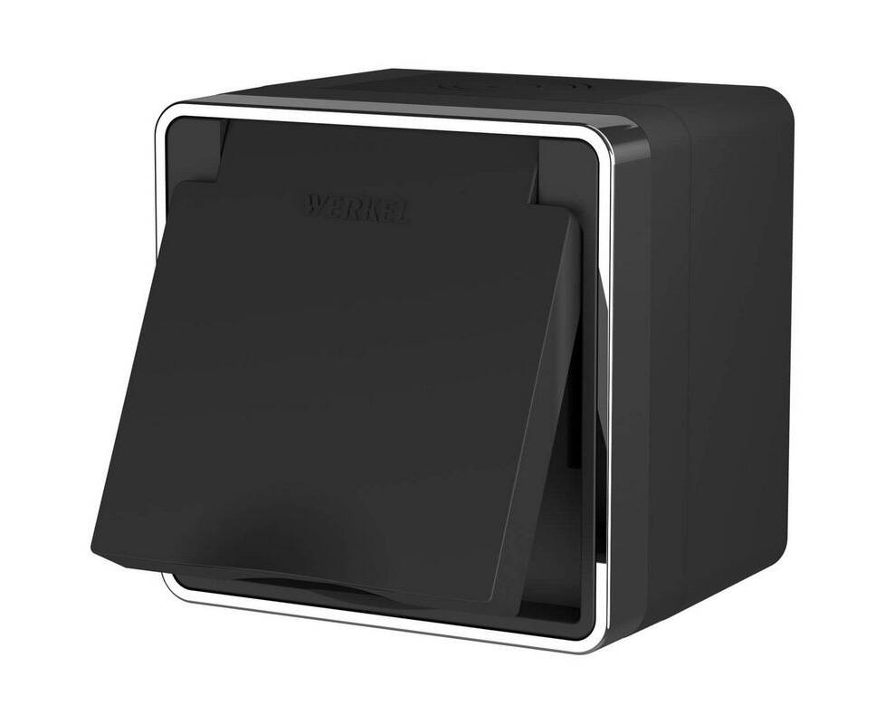 Розетка влагозащищенная с заземлением, с защитной крышкой и шторками Werkel Gallant черный/хром W5071235 4690389164637