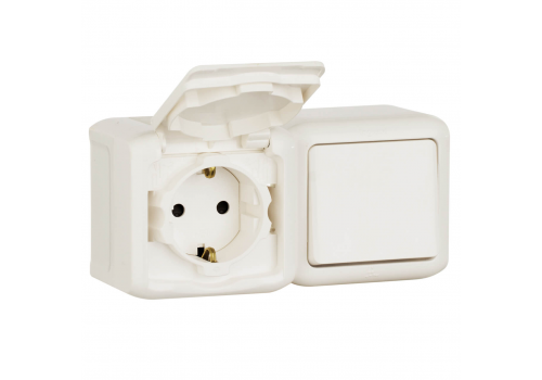 Блок выключатель одноклавишный и розетка 2К+З Legrand Quteo 16A 250V с/з со шторками крышкой IP44 белый 782318