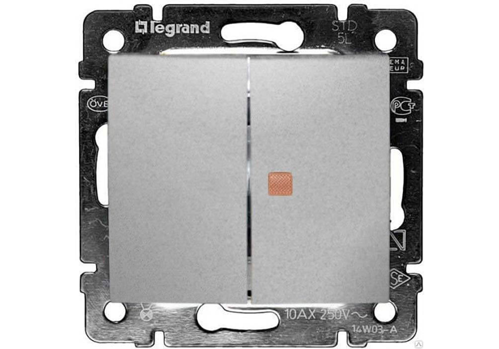 Переключатель двухклавишный Legrand Valena 10A 250V с подсветкой алюминий 770145