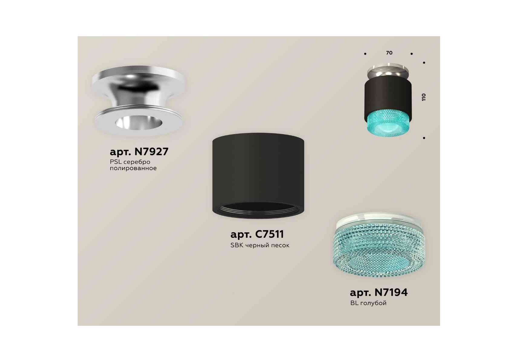 Комплект накладного светильника Ambrella light Techno Spot XS7511082 SBK/PSL/BL черный песок/серебро полированное/голубой (N7927, C7511, N7194)