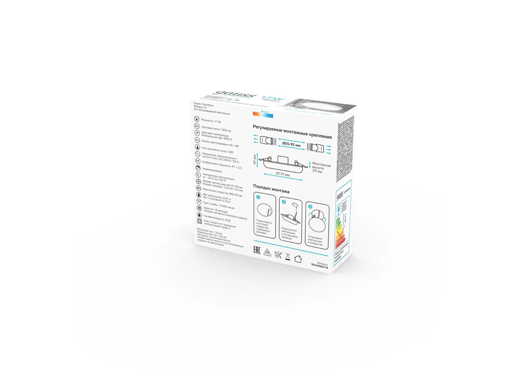 Встраиваемый светодиодный светильник Gauss Elementary Adjustable Frameless 9034460218