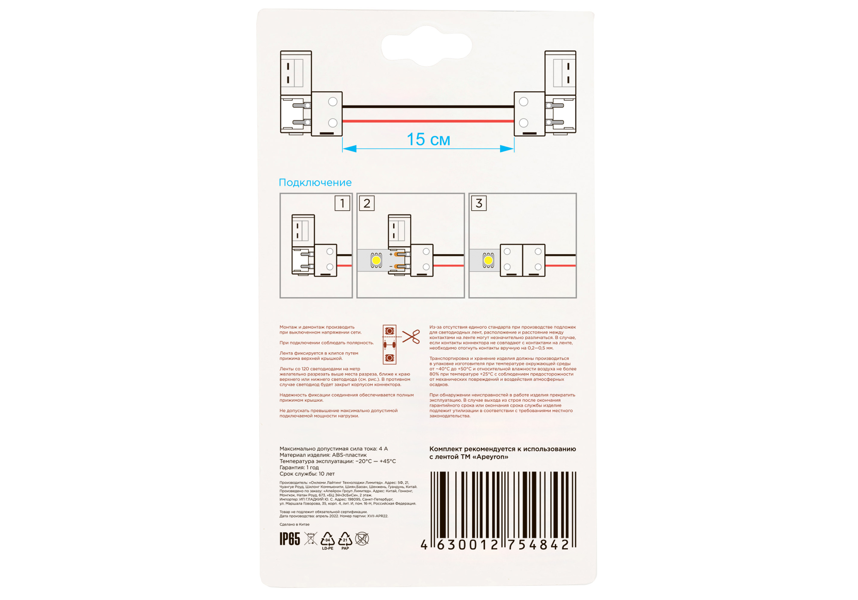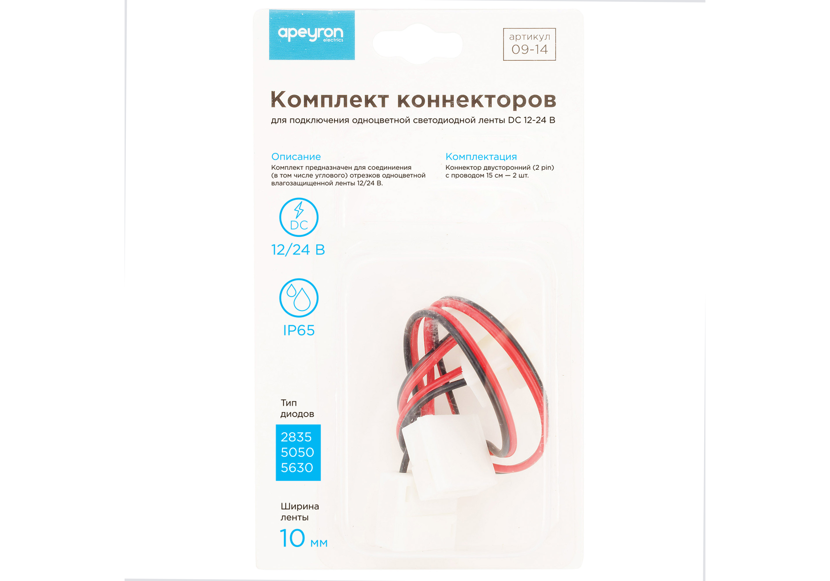 Комплект коннекторов Apeyron (2 клипсы с проводами) для одноцв светод ленты 12В ширина10мм IP65 09-1