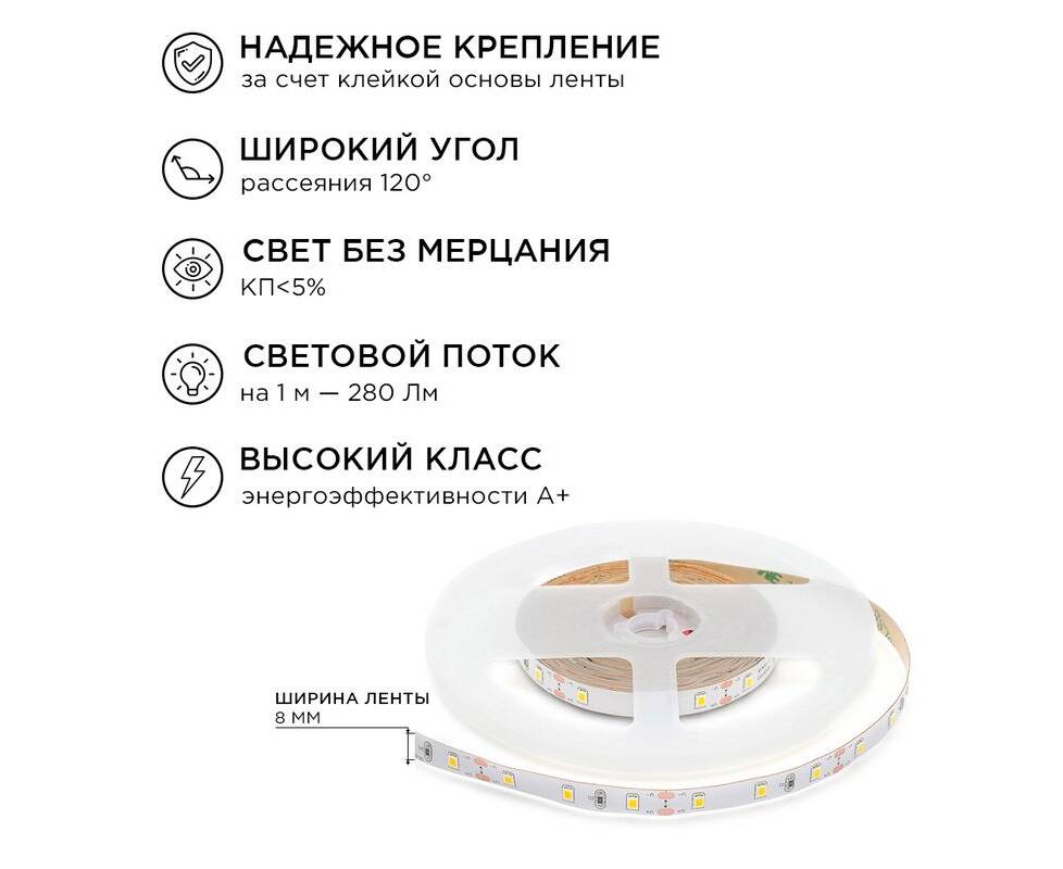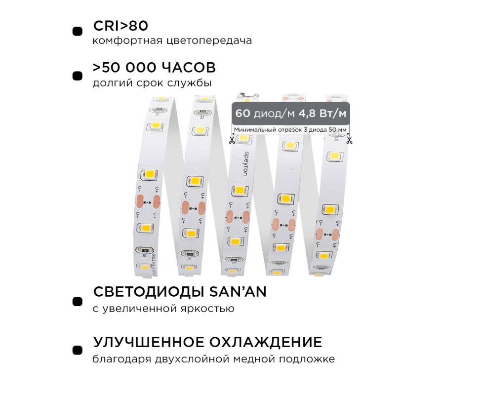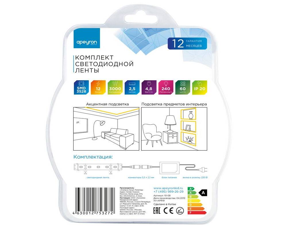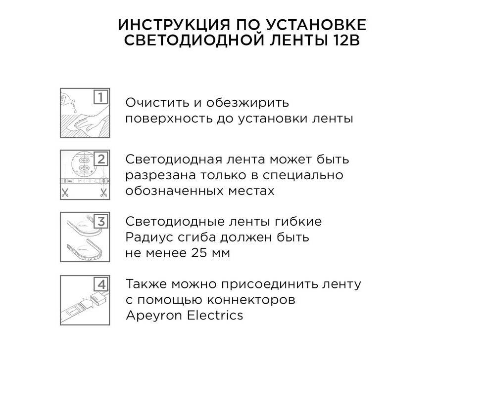 Комплект светодиодной ленты Apeyron 12В 4.8Вт/м smd 3528 60 д/м IP20 2,5м 3000K (блок, коннектор) 10